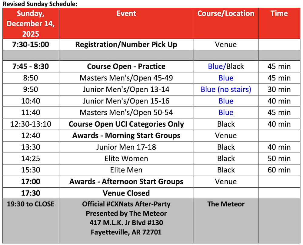 Updated schedule for Sunday's races below. Changes have been made for registration/number pick-up, course practice, and the start of the Masters Men 45-49 race. No other changes have been made.